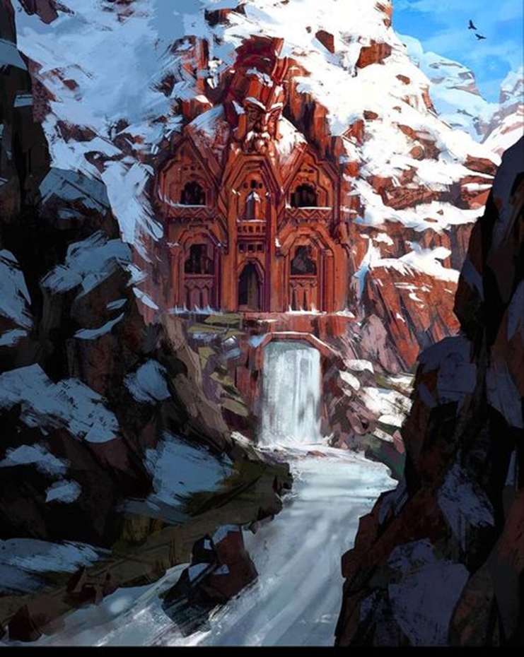 Of the hemorrhaged Grand Council, only a few remained, with morale dying nearly as fast as dwarves. One Councilor, in an effort to cheer the throng, reminded them all of their direction; it was not truth to say the host had been sent to these lands simply for survival, for they were on a mission divine. Frimdun, their Ancestor God of Work and Art, had spoken in obscured messages to the Underking's Councilor, pointing them to a specific mountain of red within the snowy white. And so, with purpose renewed and focuses realigned, did they march. When they had reached the core of the Wastes, the sun rose upon a mountain that had been on the horizon for a while, providing a radiance around the outline of a crimson glow; Azgil'or'Hûzvi, Mountain of Frozen Blood.
